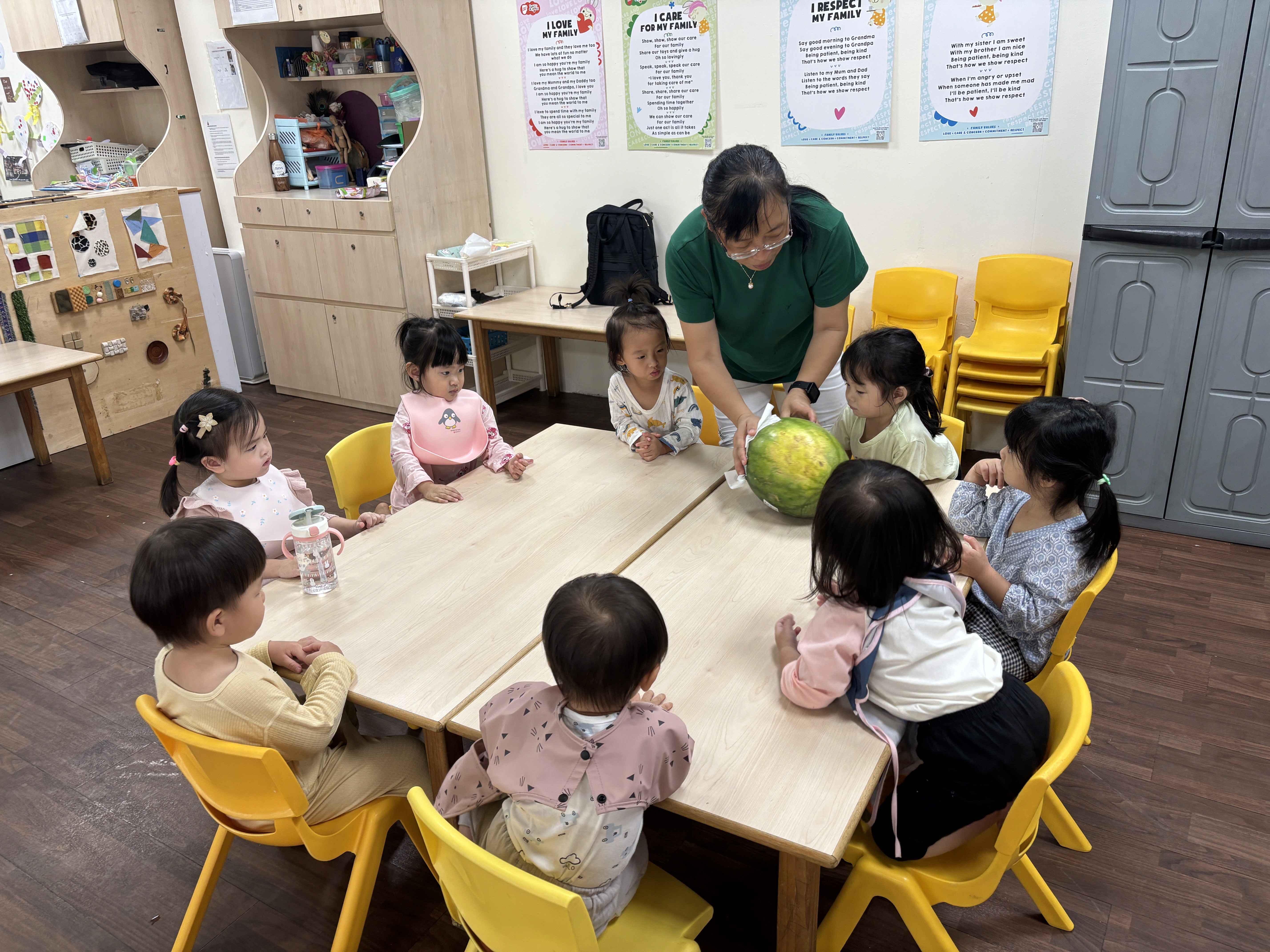 Incorporating the sensory and whole language approach to the topic of watermelon, the educator brought a watermelon for the children to touch, feel, and cut in front of them for them to eat, engaging the five senses in the process.